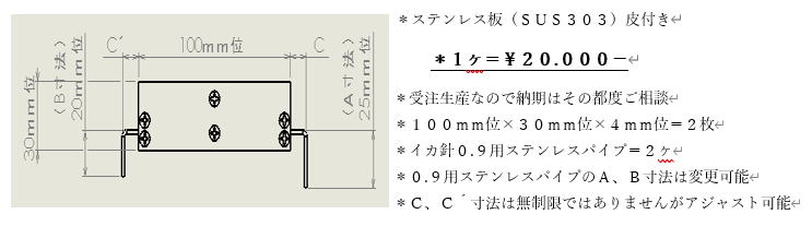 | トップページへ | イカ針先を傷めにくいカンナ治具 | イカ針の結び方 | カンナ冶具 | 二段曲げ治具、カンナ冶具、万力使用用 | L(ロング)カンナ冶具 | カンナ冶具、7穴と8穴用 | 直結用冶具 | Wカンナ冶具 | SUS、カンナ曲げ治具 |